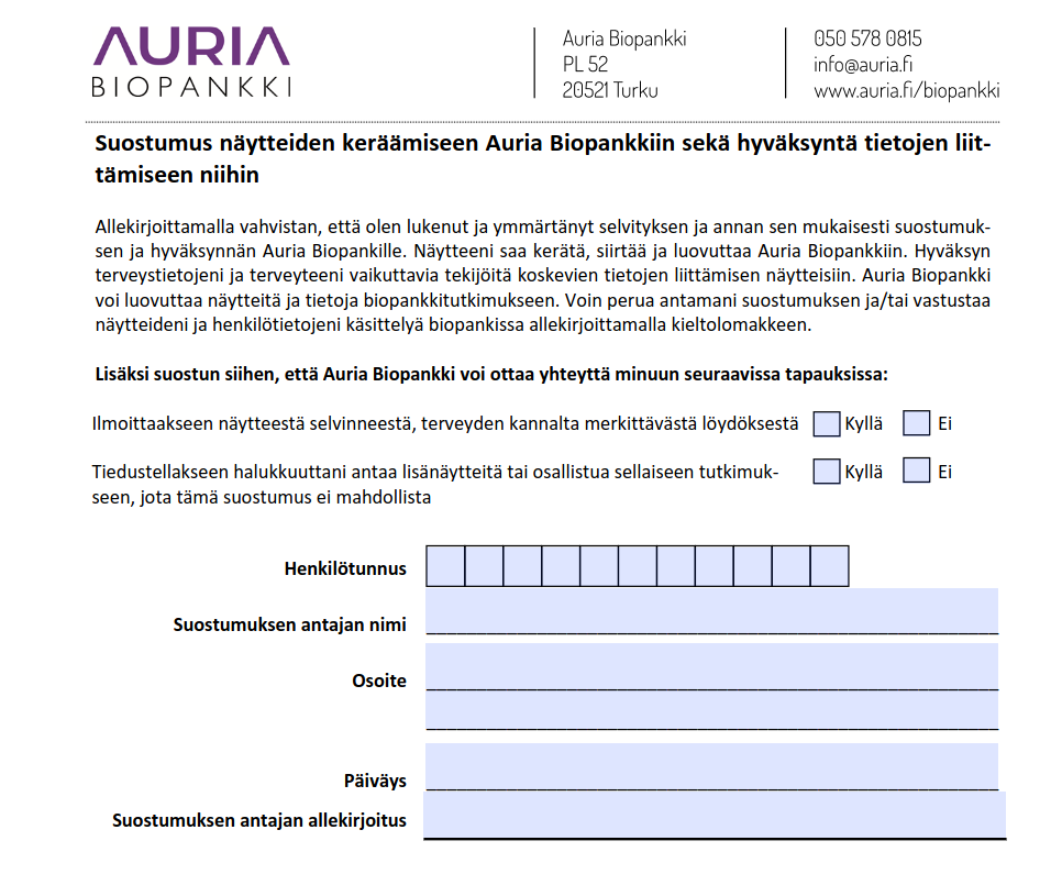 Jos et halua, että näytteitäsi käytetään Auria Biopankissa biopankkitutkimukseen, avaa alla olevasta linkistä kieltolomake, täytä se ja lähetä se lomakkeessa mainittuun postiosoitteeseen.